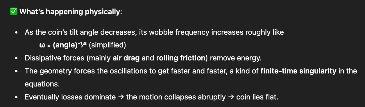 In Euler’s Disk, the math predicts an infinite wobble frequency in finite time — which reality resolves by abruptly stopping.